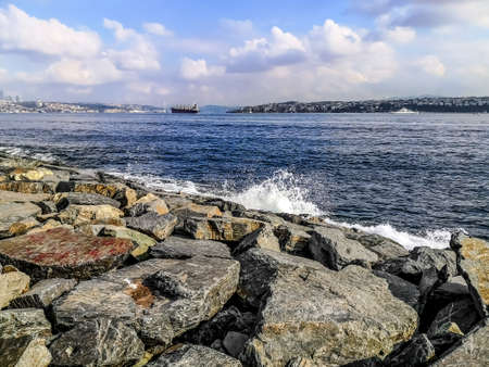Embankment of the Bosphorus and the Sea of Marmara in Istanbul (Turkey). Beautiful seascape with high splashes of waves crashing on huge boulders on the shore