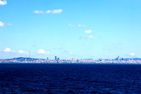 blue sea and coast with blurred Istanbul at background