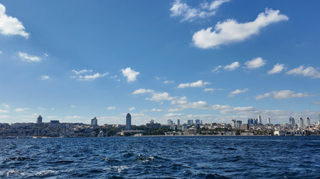 ISTANBUL, TURKEY - JULY 27, 2019: Amazing Panorama from Bosporus to city of Istanbul, Turkey