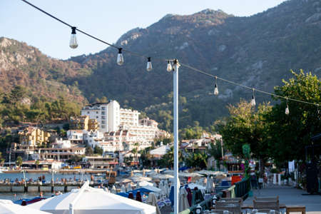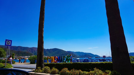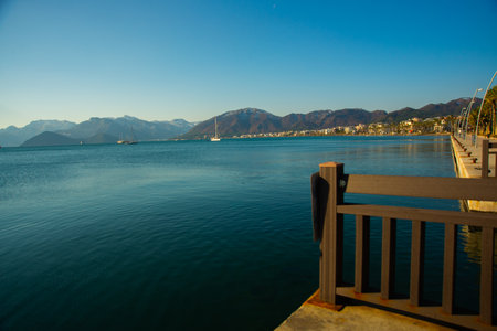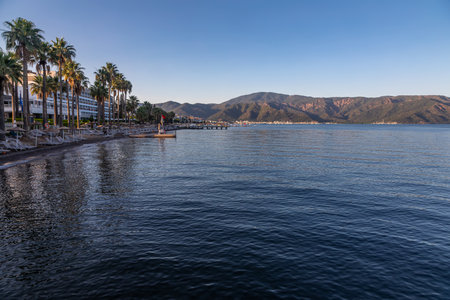 Marmaris, Turkey - September 22, 2022: Seafront against the backdrop of the picturesque bay of blue sea and mountains. Marmaris. Turkey