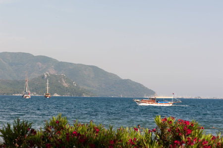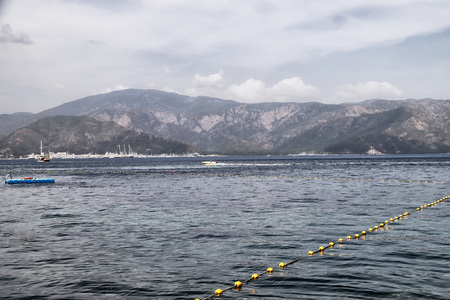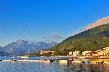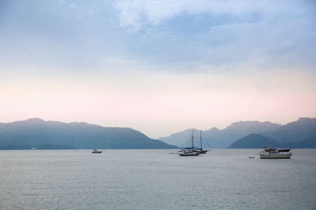 Beautiful morning seascape with boats and mountains in the background. Marmaris. Turkey