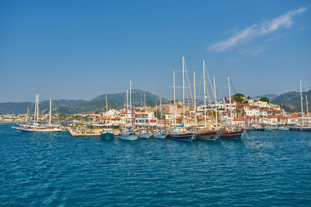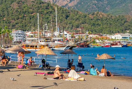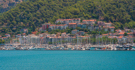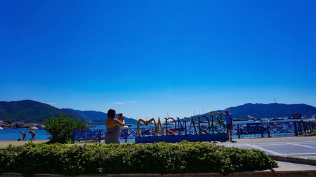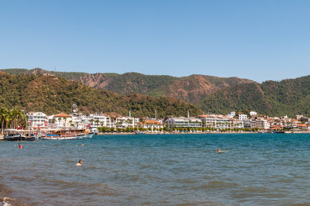 Marmaris, Turkey - 11 July 2025: Marmaris city beach and port