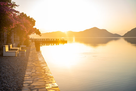 Beautiful sea coast and Adaian restaurant near Cleopatra Bath Bay, Gocek, Fethie, Turkey in the morning. High quality photo