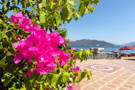Purple flowers of bougainvillaea plant with green leaves on the background of the embankment, the sea, low mountains