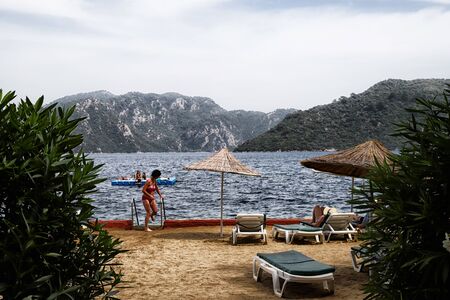 Scenic bay among the mountains and the girl enjoys the sunshine. Ichmeler, Turkey. Panoramic view touristic season vacation concept.
