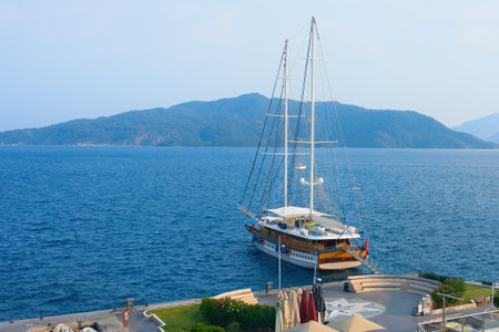 A moored beautiful yacht with a lowered gangway against the backdrop of blue water and mountains. Marmaris, Turkey.