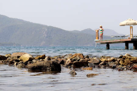 View from sea water surface with stones to misty mountains and pier with woman in bikini. Beach vacation, background for summer travel