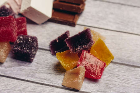 Fruit jelly bonbons on a wooden table