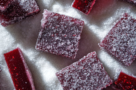 colored fruit jelly with sugar crystals, on a pink background