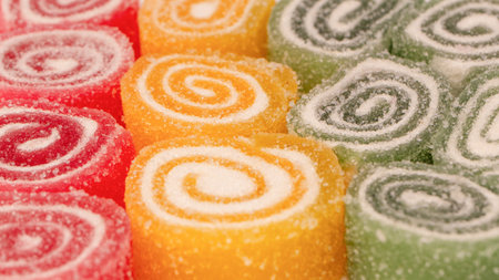 Colorful fruit jelly candies close-up macro photography with soft focus
