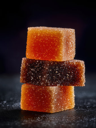 Orange and brown sugar gummy cube stack with sugar crystals and glossy texture, close up macro food candy still life with dark background and warm lighting