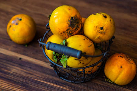 Vintage metal basket full of persimmon fruits on wooden table as a harvest concept
