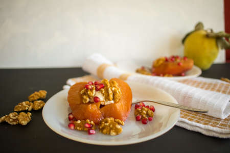 quince dessert, slice, walnut and sour pomegranate with presentation