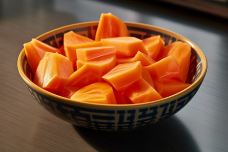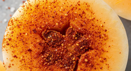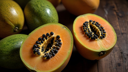 Close up of vibrant orange fruit slices arranged on a rustic wooden board, showcasing their natural seeds and texture. Perfect for healthy recipes.