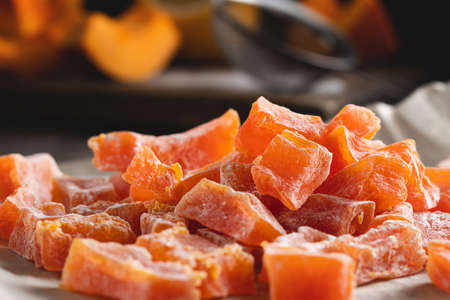 Cooking Natural farm homemade candied pumpkin fruits sprinkled with powdered sugar