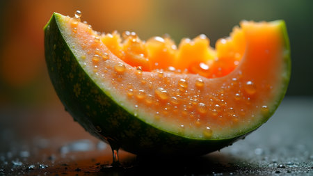 A close-up shot captures a vibrant slice of cantaloupe, adorned with glistening water droplets, highlighting its freshness and juicy texture. The dark background emphasizes the fruit's colors.