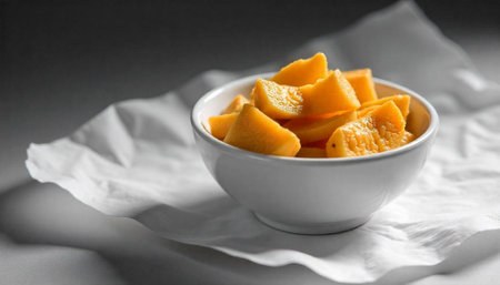 Fresh ripe mango chunks in a bowl on white fabric