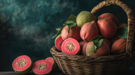 A basket filled with whole and sliced red guavas, with their vibrant red skin and pink interiors contrasting against the woven basket and a rustic table.