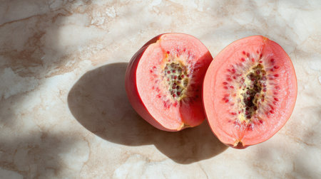 A single red guava split in half, with its rich pink interior glistening in natural light, resting on a smooth marble surface.