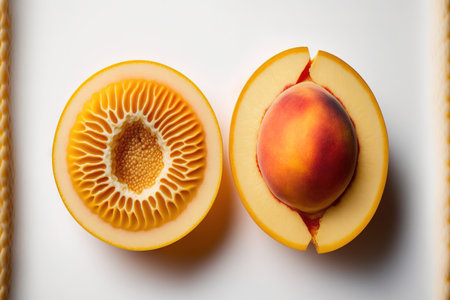 Top view of a fresh, ripe peach, shown whole, in half, and cut
