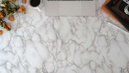 Overhead shot of stylish workplace with laptop computer, office supplies and copy space on marble desk background
