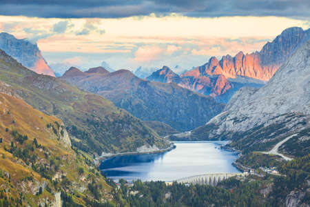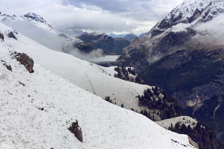 Alpine landscape in the Dolomites, Italy. Glacier Marmolada and Lago di Fedaia.