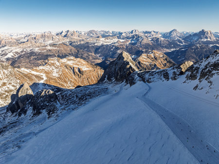 Aerial View Of Marmolada Glacier From Drone, Dolomite Mountains. Sella Ronda group and the Marmolada group in winter.