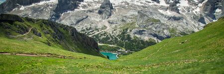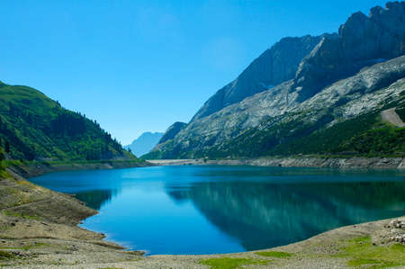 Marmolada (Passo Fedaia, Trentino Alto Adige, Italy), mountain landscape at summer in a sunny day, the lake