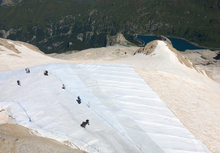 people walking on the white protective sheet installed above the glacier of MARMOLADA mountain in the Dolomites mountain group in the European Alps in summer