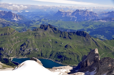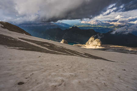 Wide panorama from Punta Rocca / 3265 m / of the Marmolada array towards Sella Group and Lake Fedaya, Dolomiti, Italy.