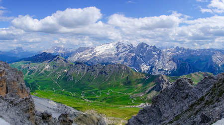 View of the winding, mountain road and the highest mountain in the Dolomites - Marmolada