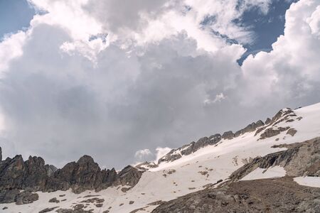 Scenery landscape with high rocky mountain under cloud sky in Alps. Copy space in left side