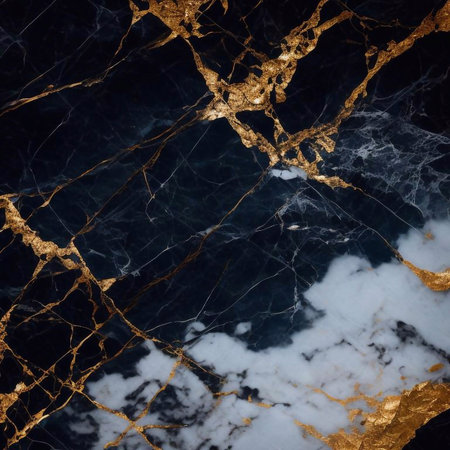A stunning display of black marble featuring intricate white and gold veining, highlighting the natural patterns and textures found in this luxurious stone. Perfect for design inspiration.