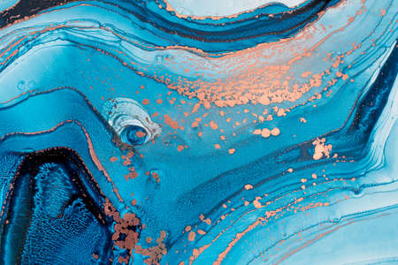 Acrylic Fluid Art. Blue colors waves in abstract ocean of blue paint and golden swirls. Marble effect background or texture