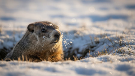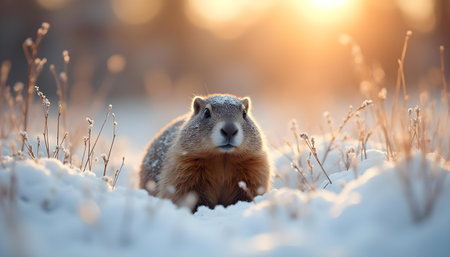 Groundhog peeks from snow, golden hour light, winter landscape.