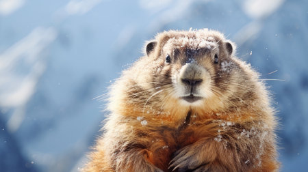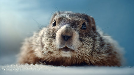 Marmot looking directly at viewer with bright eyes, its brown fur and whiskers visible in a detailed close up shot against a soft blue background in winter terrain