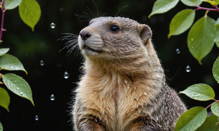A groundhog stands in the rain, looking up at the falling drops, surrounded by green leaves