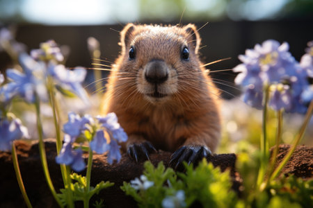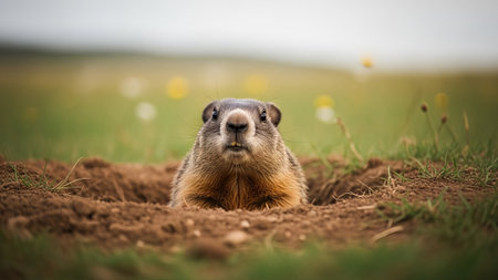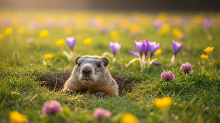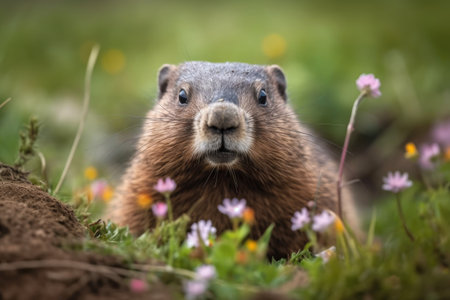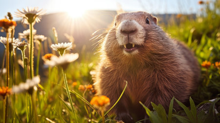 A cute fluffy marmot crawled out of its hole among meadow grasses and flowers on a sunny spring day. The traditional holiday is Groundhog Day in the USA and Canada, on which he will see his shadow, early spring or long winter.