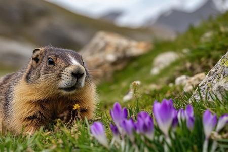 marmot on alpine meadow with crocus flowers