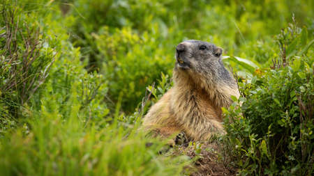 Attentive alpine marmot observing in bush in mountains