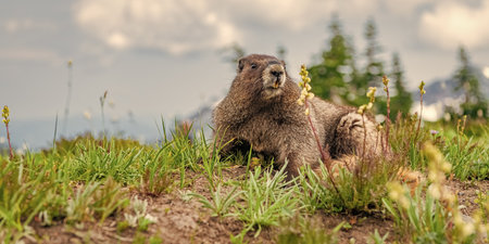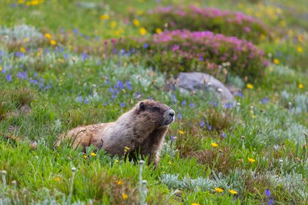 A hoary marmot gathering grasses from a nearby meadow in Mount Rainier National Park in Washington state