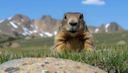 A curious marmot stares directly at the camera, perched on a rock in a grassy field with snow-capped mountains in the background The marmot's inquisitive expression and the scenic backdrop create a charming and captivating image AI Generative