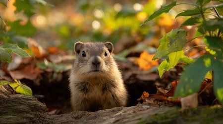 A charming groundhog, cheeks puffed out, snuggles in a decorative scarf amid golden foliage, evoking cozy autumn warmth in a gentle, blurred landscape.