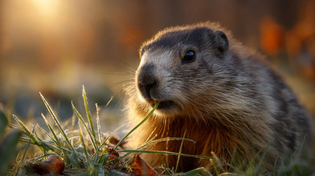 An illustration of a cute groundhog in the bokeh style and a surprise with a bright sun.Portrait of standing alpine marmot (Groundhog - Marmota marmota) against blurred forest background.portrait of a marmot sitting behind a tuft of grass.