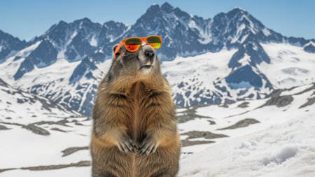 A marmot wearing sunglasses poses confidently in front of a stunning backdrop of snow-covered mountains under a clear blue sky.