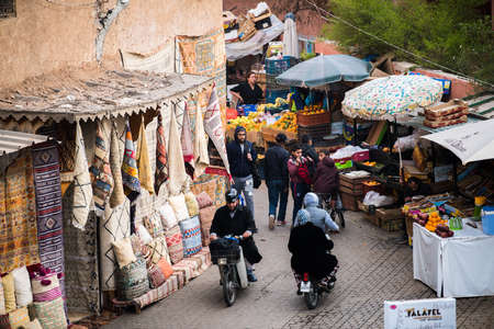 Marrakesh, Morocco - February 28, 2020: A typical street in the ancient Medina district of Marrakech. Photo contains local people doing various activities.