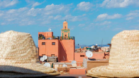 Typical colorful buildings of the Marrakesh medina on a sunny day with a blue sky and some clouds. Hats out of focus in the foreground. Travel concept. Marrakech, Morocco