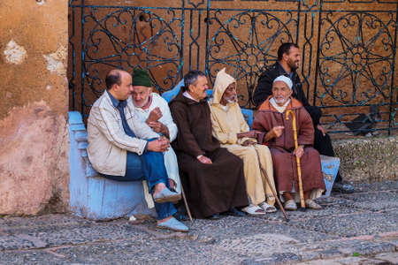 Meknes, Morocco - Oct 16, 2019: Three men at Gate Bab El-Mansour at the El Hedim square in Meknes. Meknes is one of the four Imperial cities of Morocco.