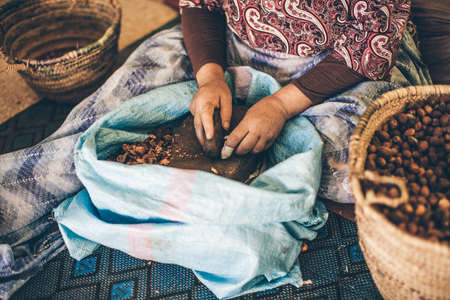 Moroccan woman selecting argan fruits to extract argan oil with the traditional way. Souss Massa, Morocco.