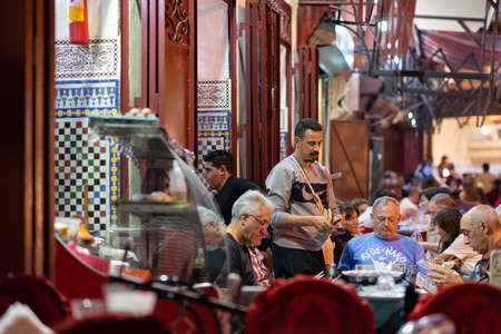 Fes, Morocco - Oct 15, 2019: Typical street market in the old medina of Fes, Morocco in Africa